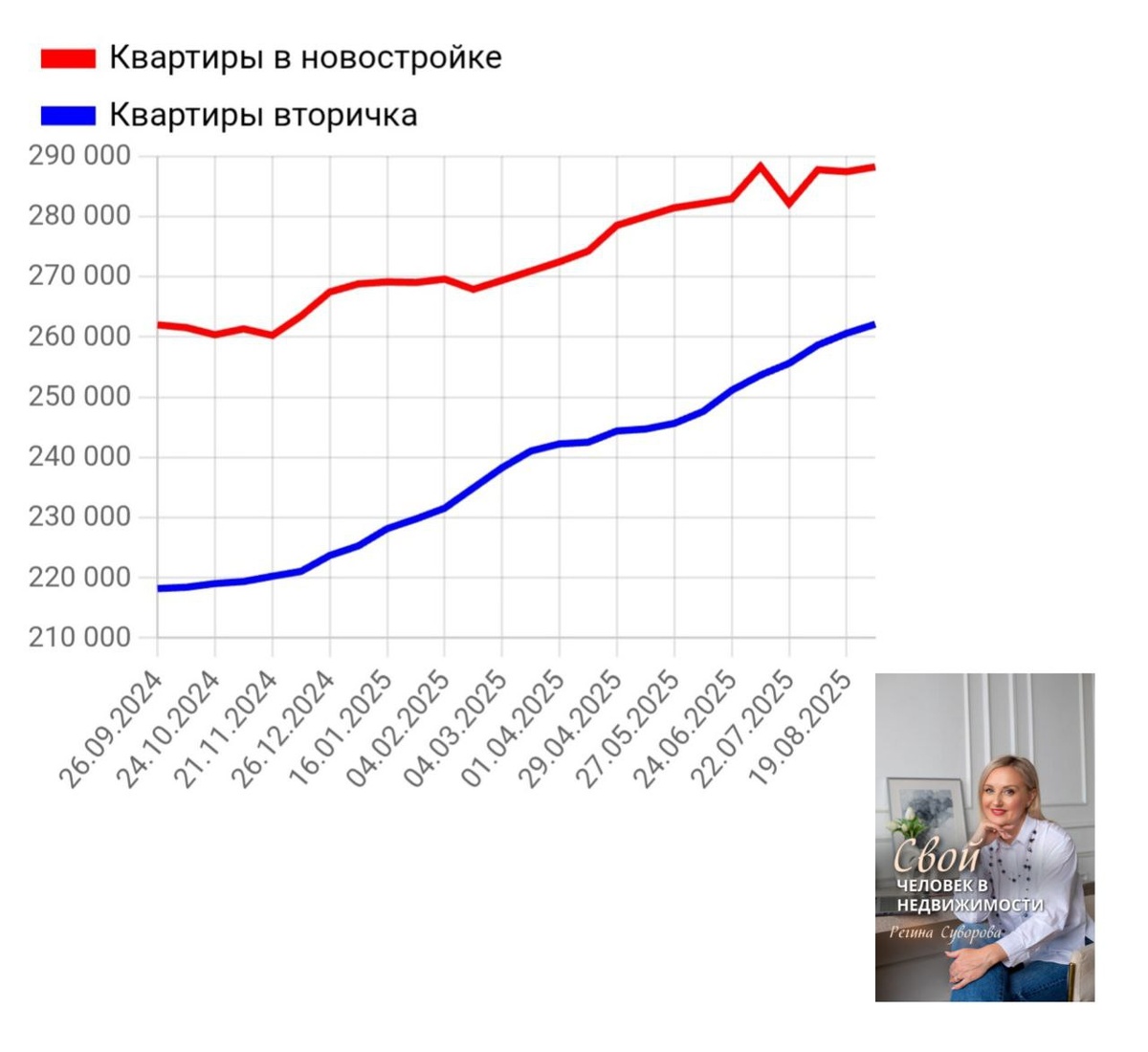 Прогноз цен на рынке новостроек до 2030 года Согласно последним аналитическим исследованиям, стоимость квадратного метра на первичном рынке будет ежегодно увеличиваться в среднем на 6–10%, опережая уровень инфляции. Уже к 2027 году разрыв между ростом цен на недвижимость и инфляцией может достигнуть двукратного значения. Что это означает для покупателей? Приобретение квартиры в настоящий момент является наиболее рациональным и выгодным решением, поскольку стоимость недвижимости в ближайшие годы будет только расти. Квартира сегодня — это не только надежное средство сохранения капитала, но и перспективный инвестиционный инструмент. Я помогу вам выбрать проект с наиболее интересной перспективой роста цены! "Свой человек в недвижимости " Регина Суворова +79119418511