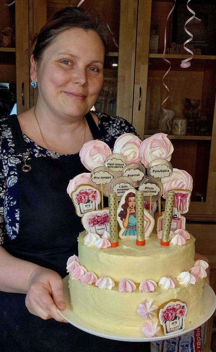 Рецепт ⬇ Внутри торты одинаковые, а вот украшены по-разному! 1⃣ Двухъярусный торт покрыт шоколадом, украшен пряниками и безе. 2⃣ Второй торт украшен маленькими цветами из БЗК. "Бисквитный торт «Клубничный» СОСТАВ⬇️ Бисквит: Яйца – 5шт. Сахар – 150гр.(6ст.л.) Мука – 150гр. Конфи: Клубника – 350гр..(замороженная) Сахар – 80гр. Крахмал – 15гр.(кукурузный) Крем: Сливки 33 – 400гр. Сахарная пудра – 80гр.(4ст.л.) *Можно добавить творожный сыр Белково - заварной крем: Сахар – 400гр. Белки – 150гр. Вода – 100гр. Огонь меньше среднего! ~~~~ ПРИГОТОВЛЕНИЕ⬇️ Бисквит: Яйца взбиваем с сахаром до получения пышной белой массы. Проверяем на бороздку пальцем – должна не сразу заплывать. Аккуратно вмешиваем муку. Выпекаем 170°-175°/50 минут. Конфи: Замороженную ягоду выкладываем в кастрюлю. Ягода размораживается и даёт сок – всыпаем сахар и крахмал. Варим 3-5 минут до загустения. Пробиваем блендером. Крем: Холодные сливки взбиваем с сахарной пудрой. Не перевзбить Можно добавить ≈ 300 гр. творожного сы