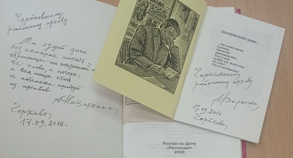 Недавно дочь поэта Анатолия Степановича Назаренко, Юлия Сандульская, передала на хранение в архивный сектор Администрации Чертковского района личные документы своего отца для открытия архивного фонда личного происхождения. Среди документов — переписка с известными поэтами и писателями, многочисленные грамоты, публикации, книги…