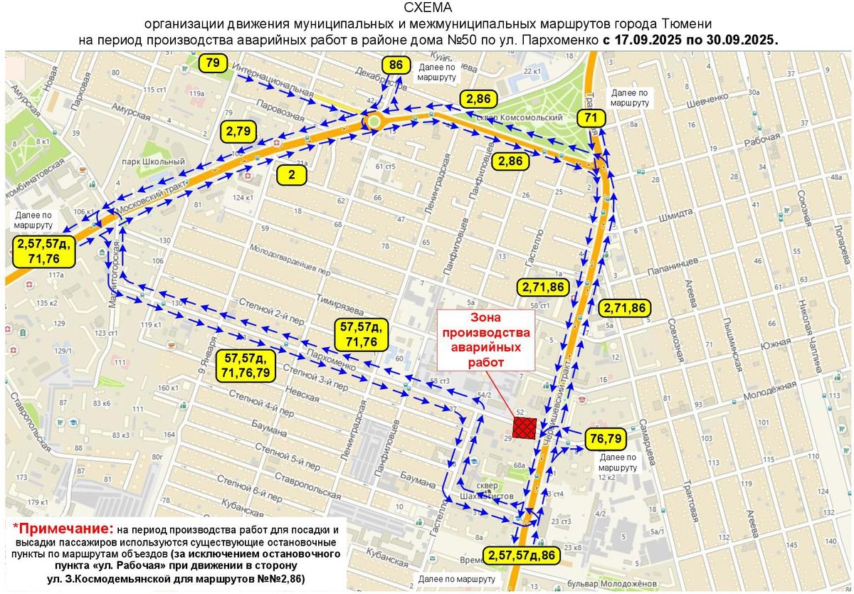 Перекрытие по ул. Пархоменко В период с 17 по 30 сентября 2025 года в связи с выполнением работ в районе дома № 50 по ул. Пархоменко маршруты №№ 2, 57, 57д, 71, 76, 79, 86 будут следовать в объезд перекрытого участка со всеми существующими остановочными пунктами по маршрутам объезда. Расписание для пассажиров общественного транспорта доступно в разделе «Расписание» на сайте tgt72.ru, в мобильном приложении «Тюменский транспорт», по бесплатному номеру телефона информационно-справочной службы 8-800-250-0722 и на остановках.