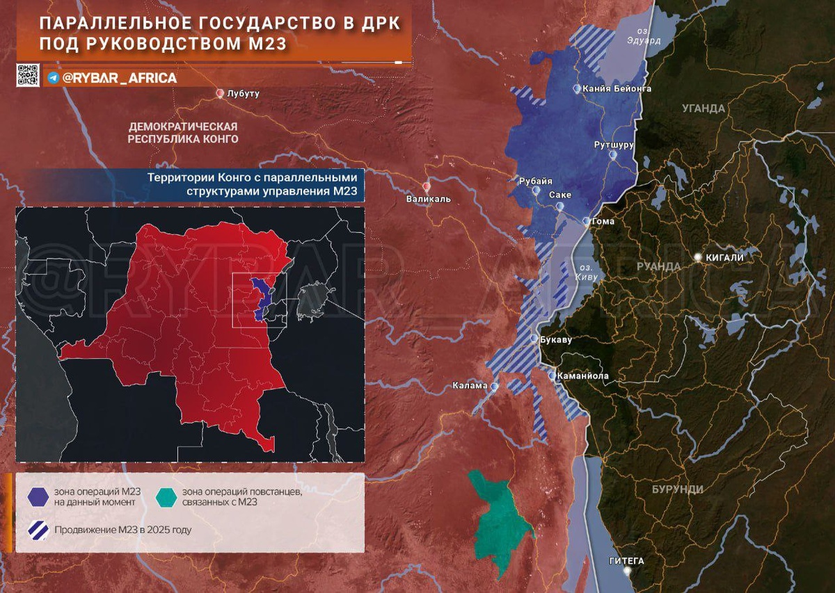 #Африка Государство в государстве М23 строит своё государство в ДРК В начале 2025 года «Движение 23-го марта» (M23, террористическая организация) при поддержке Руанды захватило крупнейшие города восточной части ДР Конго — Гому и Букаву, тем самым переломив баланс сил в регионе. За несколько месяцев группировка не только расширила зону своего военного контроля почти до 5,8 тысяч квадратных миль, но и приступила к масштабному проекту по созданию собственных государственных институтов. На базе инфраструктуры Гомы и Букву группировка развернула ускоренное строительство управленческого аппарата, назначила чиновников на ключевые должности и выстроила цепочку контроля до уровня местных сообществ. M23 создало альтернативный финансовый механизм, пытаясь уменьшить зависимость региона от национальной экономики, и стало активно использовать ресурсы для организации минимального уровня услуг в городах и сельских районах. Отличие нынешней стратегии M23 заключается в стремлении к долгосрочному