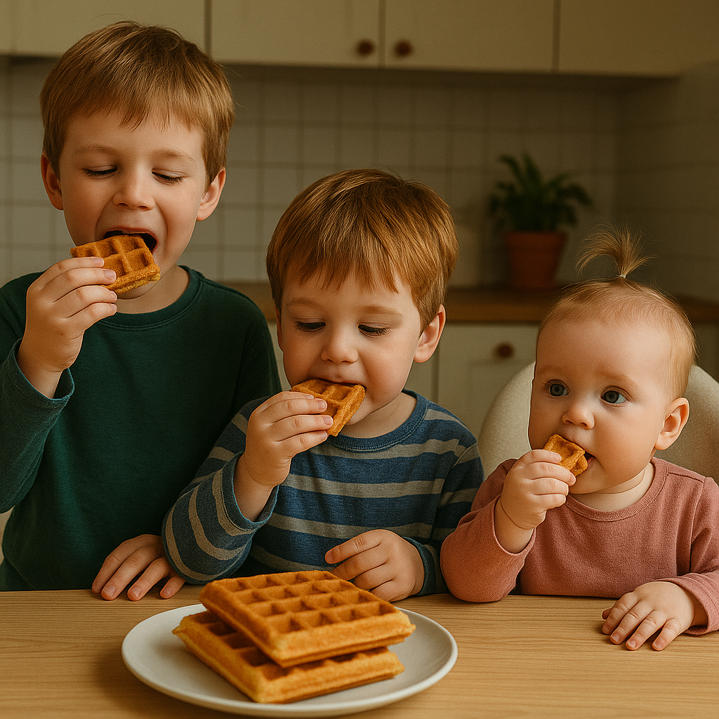 Максим выдал: «Мам, это не вафли, это... как тёплое одеяло!» Миша схрумкал три штуки. Даше дала кусочек, она сжала его в кулачке, размазала по щеке, но выглядела довольной.