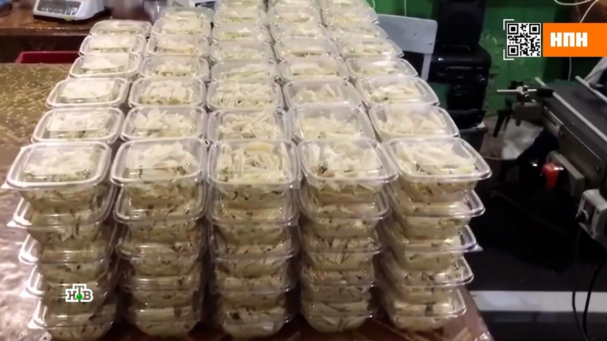 [ Смотреть видео на сайте НТВ ] Репортеры программы «НашПотребНадзор» выяснили, как и в каких условиях готовят салаты, супы и другие блюда для сервисов доставки и супермаркетов. Спрос на готовую еду подогревают не только уставшие от быта работающие россияне, но и молодежь, которая едет в большие города, а пекущих пирожки мам и бабушек рядом нет. Но только вот чтобы построить технологичную фабрику-кухню, где будут кашеварить профессионалы, нужны и время, и финансы, и желание. Продюсерам программы удалось проникнуть на кухню этого бизнеса и увидеть очень неаппетитную начинку. В итоге выяснилось, что в цеху по производству готовой еды прямо в центре Москвы хранят мясо на полу рядом с помойным ведром. Также на полу преют овощи. А под витриной копятся горы грязи. На работу туда продюсеров приняли, не спросив даже паспорта, не говоря уже о медицинских справках. Переодеться в сменную одежду негде. Переобуваться предлагают прямо рядом с разделочным столом. А коллег интересует лишь одно: есть л
