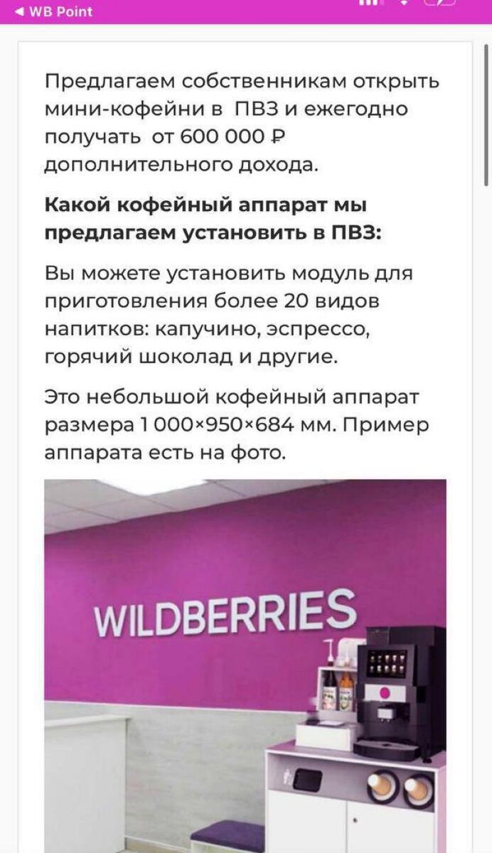 На днях WB предложили владельцам ПВЗ поставить кофемашину за 200 тысяч или взять её в лизинг