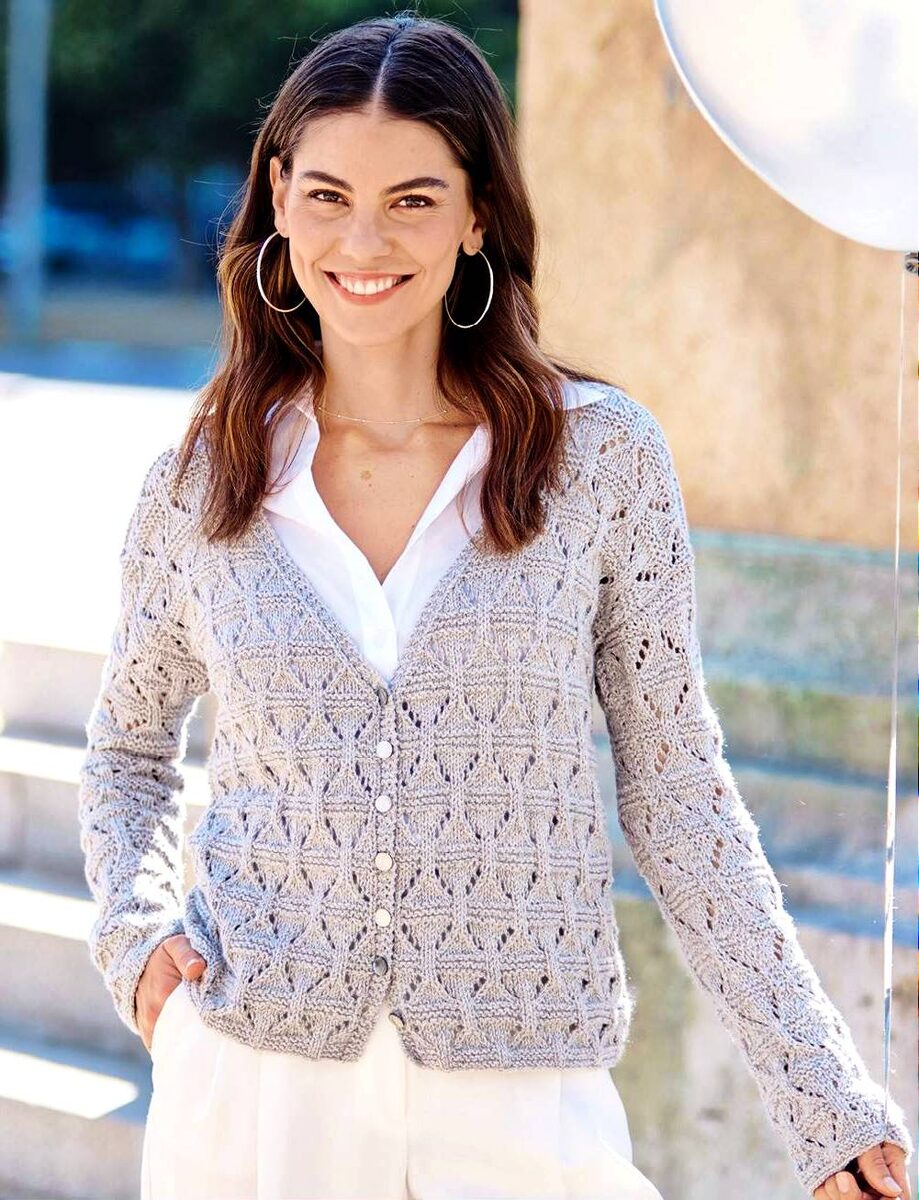 Лёгкая пряжа из хлопка и акрила светлого серого оттенка подходит к любому стилю, а узкие планки для пуговиц вяжутся вместе с передними деталями платочной вязкой. Пояс и отделка V-образного выреза не требуются, остаётся только сшить детали и наслаждаться шикарным результатом!