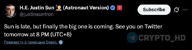 Основатель Tron снова обещает громкий анонс завтра в 15:00 МСК.