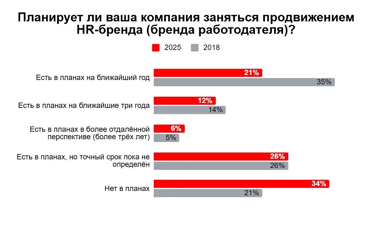 Ой, беда! Многие компании забили на свой имидж работодателя, а зря! Только треть (даже крупных!) вообще этим занимаются. Малый бизнес совсем отстал – там только треть парятся о репутации. А зря, ведь хороший HR-бренд – это круто, особенно для привлечения талантов! Кто-то не знает как, кто-то жадничает, кто-то думает, что и так сойдёт. Но те, кто в теме, понимают, что без этого никак - конкуренция жёсткая!