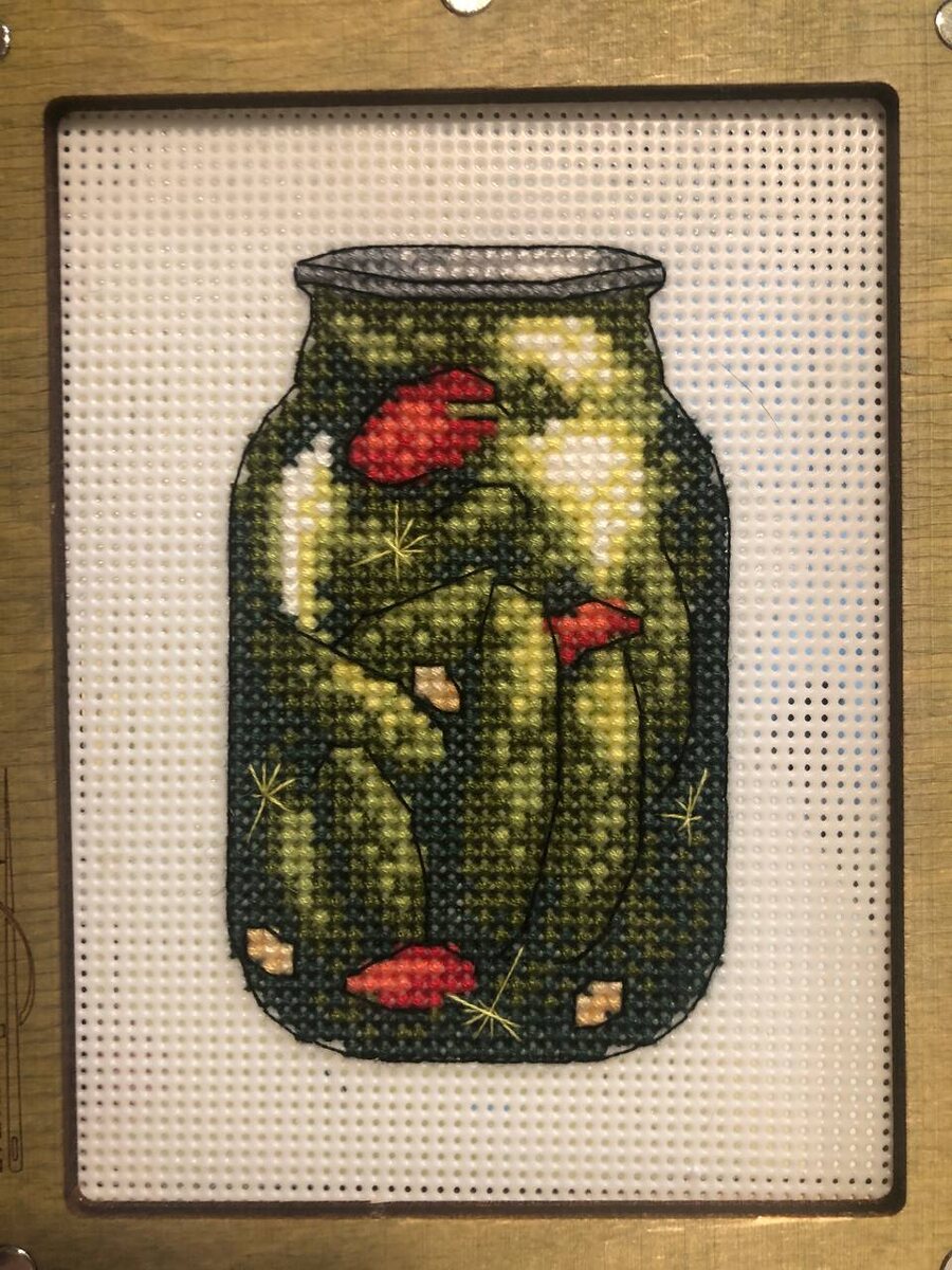 Финиш Баночки с огурцами от Жар-птицы 🥒 Пора собирать урожай и заниматься закатками! Я уже свою задачу выполнила - на холодильник одну баночку отправляю))) Она поменьше чем баночки с вареньем, которые недавно Вам показывала. Но как необычно смотрится 👍 Вышивается легко, цветов не много, схемка цепочками. В этой баночке 1636хх