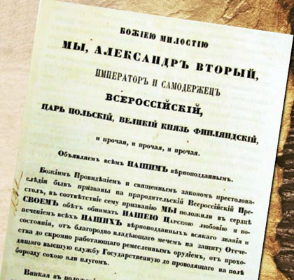 19 февраля 1861 года император Александр II подписал давно назревший манифест «О Всемилостивейшем даровании крепостным людям прав состояния свободных сельских обывателей» и «Положение о крестьянах, выходящих из крепостной зависимости». Крепостное право в России наконец-то отменено! Что же представляла собой эта реформа и почему не вызвала восторга практически не у кого? «Порвалась цепь великая, Порвалась — расскочилася Одним концом по барину, Другим по мужику!..» - писал позже великий Н.А.Некрасов. Недовольство дворян-помещиков понять легко — они лишались бесплатной рабочей силы и привычного способа хозяйствования. Теперь нужно приспосабливаться к жизни по новым — капиталистическим правилам. Но недовольны реформой оказались и сами крепостные крестьяне. Крестьянские волнения охватили все губернии, затронутые реформой. Почему? По новому положению все крепостные крестьяне получали личную свободу немедленно — т.е. свободу перемещения, сделок, заключения брака и пр. Однако, бывшие крепостны