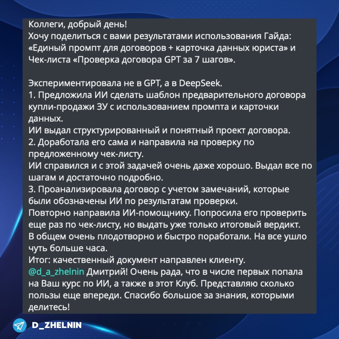 ✨ Юристы проверили — и оно реально работает! Я обещал, что буду лишь изредка рассказывать вам, что мы делаем в "Клубе юрИИстов". Не хочу превращать канал в бесконечную рекламу. Но сегодня как раз тот случай, когда не поделиться ну совсем нельзя 😉. Две недели назад в клубе мы сделали сразу два инструмента: — гайд "Единый промпт для договоров + карточка данных юриста", — и чек-лист "Проверка договора GPT за 7 шагов”. Цель была простая: дать юристу понятные и рабочие материалы, которые можно использовать сразу, а не "в теории или когда-нибудь потом". Сегодня прилетел отзыв. Настоящий, от юриста, который уже применил документы в работе: "...Применила на практике. Всё работает. Даже в DeepSeek проверила — тоже заходит. Впервые вижу такие инструменты, где сразу понятно, что делать"... Полный текст отзыва ☝️ Вот это для меня лучший маркер: значит, мы делаем не красивые презентации, а боевые инструменты, которые помогают юристам экономить время и деньги. И что важно ☝️ они работают не то