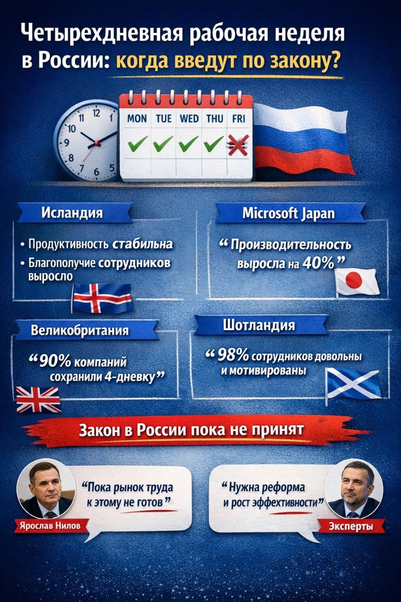 В середине сентября 2025 года глава думского комитета по труду Ярослав Нилов вновь заговорил о постепенном переходе России на четырехдневную рабочую неделю. Это заявление, как и предыдущие, мгновенно раскололо общество: работники предвкушают лишний выходной, а бизнес скептически хмурится. Давайте разберемся, насколько эта перспектива реалистична для нашей страны, отбросив популизм и взглянув на факты. Мировой опыт: получилось не у всех Сторонники реформы активно ссылаются на положительный зарубежный опыт. А ведь он действительно имеется, но картина не так однозначна, как ее представляют. Что же это это значит? Опыт доказывает, что формат работает там, где результат труда измеряется не отсиженными часами, а выполнением конкретных задач. Для конвейерного производства или сферы услуг с ее почасовой оплатой это гораздо более сложная задача. Российская действительность По российским законам препятствий для четырехдневки почти нет. Статья 91 Трудового кодекса определяет норму в 40
