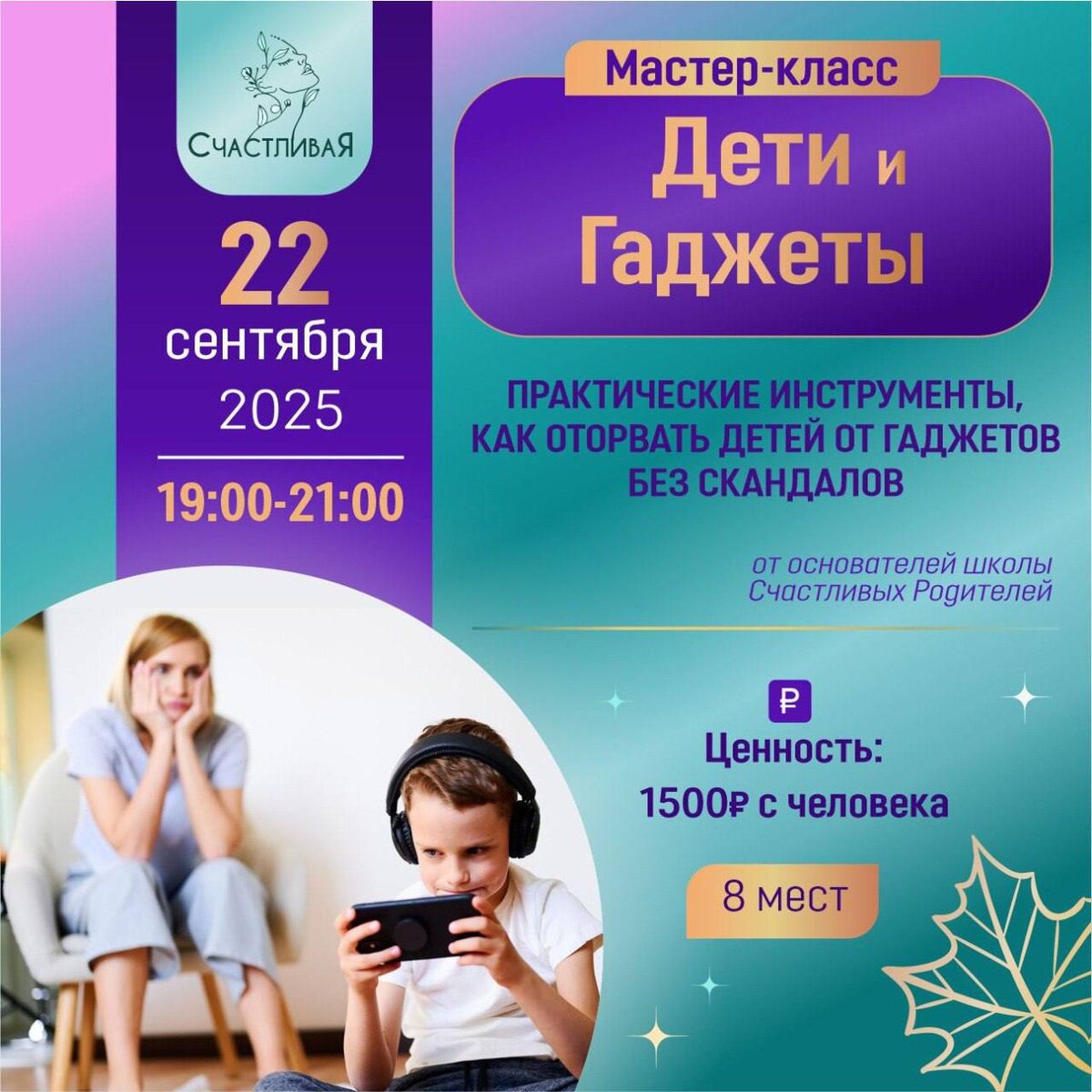 Очень острая тема для всех родителей!🤬 МАСТЕР-КЛАСС:ДЕТИ И ГАДЖЕТЫ!📱📱📱📱 Как оторвать детей от гаджетов без скандалов! Мы подготовили для вас полезный мастер-класс от семейной пары, основателей онлайн школы «Для счастливых родителей» @yulia_rassel https://t.me/Rassel_School На двухчасовом мастер-классе вы узнаете практические инструменты, которые сразу сможете внедрить: 👩💻Как безболезненно минимизировать гаджеты 👨💻как договариваться об экранном времени 👩💻лишать гаджетов, как наказание? 🧑💻 как действовать при истериках? 👩💻 ревизия нашего потребления гаджетов, как взрослых. 🗓️22.09 с 19.00-21.00 📍Первомайская, 60 🎀 Вклад в себя и свое спокойствие-1.500₽ 🎁 скидка 500р, если приходишь с подругой/мужем/мамой и тд ⏳Всего 8 мест — успевай занять своё! Для бронирования участия напиши мне в личные сообщения 8-912-22-23-183 Василина Денисочкина или +7 993 513-18-18 СЛУЖБА ЗАБОТЫ КЛУБА 🦋