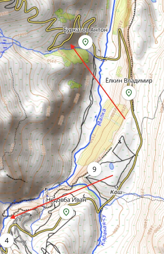 а мы уже наблюдаем что спортсмены выбрали разные пути, Буркатов и Елкин идут по более короткому но крутому маршруту, а основная группа пошла по более пологому но длинному