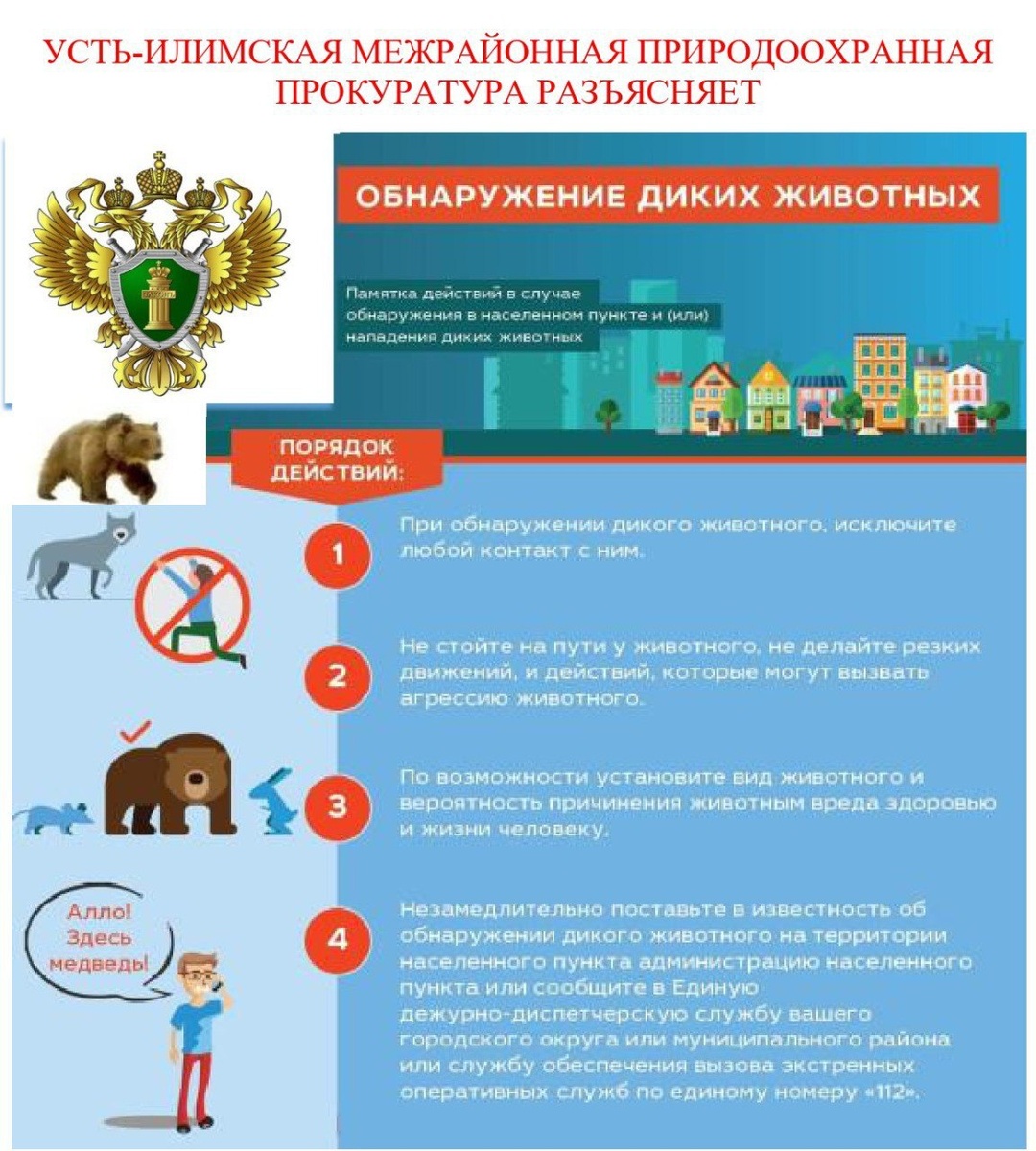 В последнее время участились случаи выхода диких животных в населенные пункты. Что делать, если произошла внезапная встреча с лесным жителем, смотрите карточку.