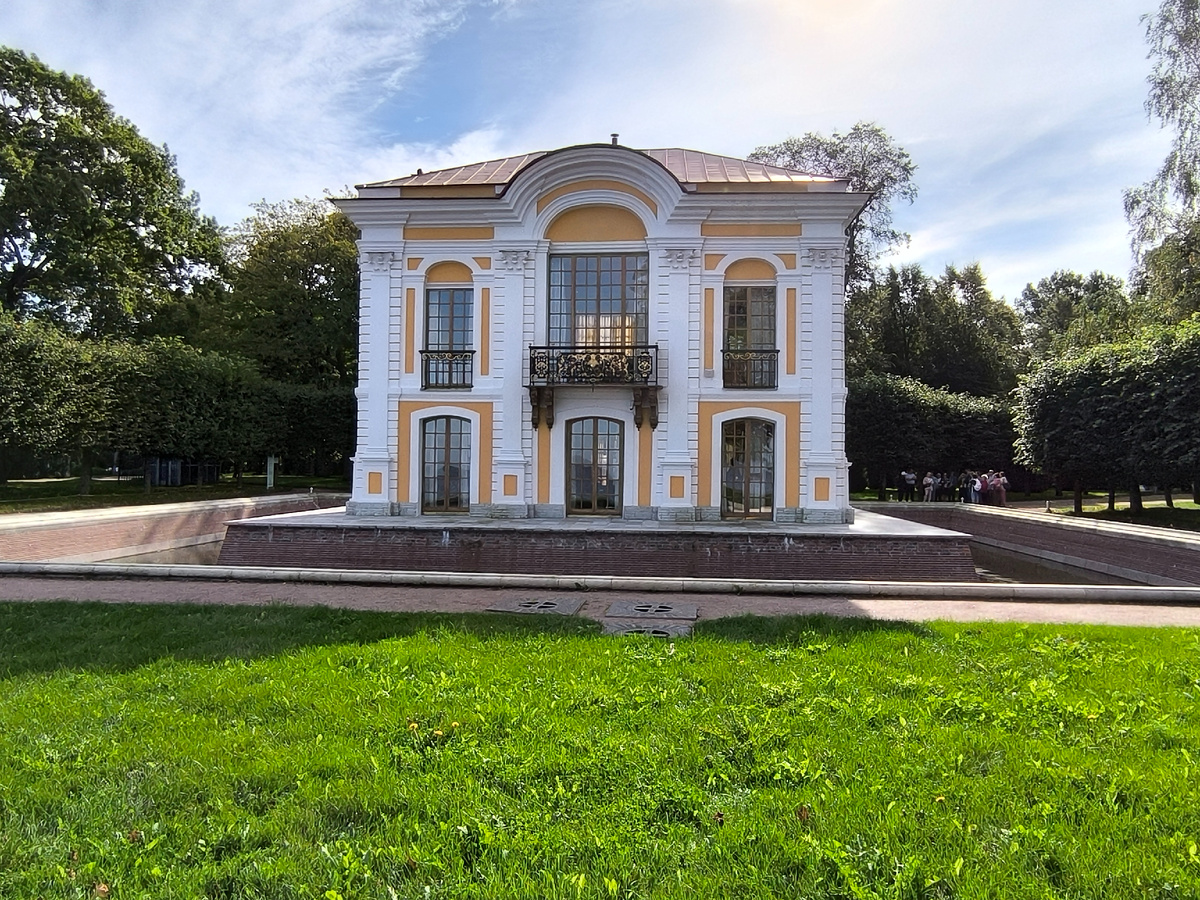Перед нами Эрмитаж. Строился при Петре Великом и задумывался для приватных трапез, когда нужно было обсуждать важные вопросы и при этом, чтобы слуги не грели уши. Для этого в здании был установлен лифт для подачи блюд на второй этаж, где проходила приватная трапеза. Слуг на втором этаже не было и подслушать разговоры за столом они не могли. Виды со второго этажа конечно роскошные -- на Финский залив. Здание было разрушено фашистами и отстроено заново.
