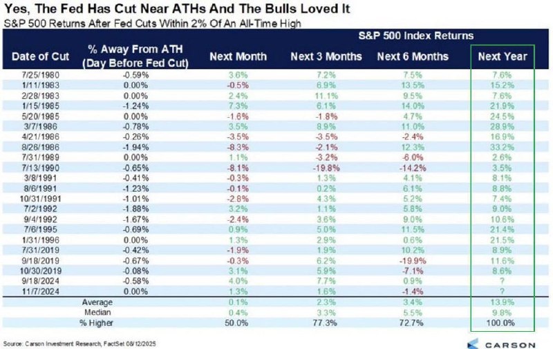 Каждый раз когда ФРС снижала ставки в пределах 2% от исторических максимумов по индексу SP500, по итогам следующих 12 месяцев акции были