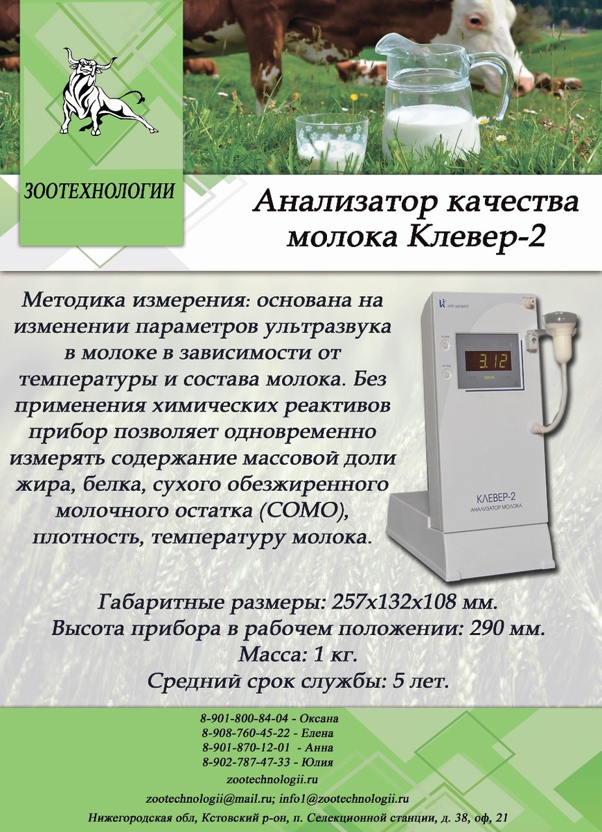 В продаже анализатор жидкости ультразвуковой «УЛИКОР», отградуированный в исполнении «Клевер-2», — прибор для экспресс-оценки процентного содержания жира, белка, сухого обезжиренного молочного остатка (СОМО) и плотности в одной пробе свежего цельного, консервированного молока или сливок.