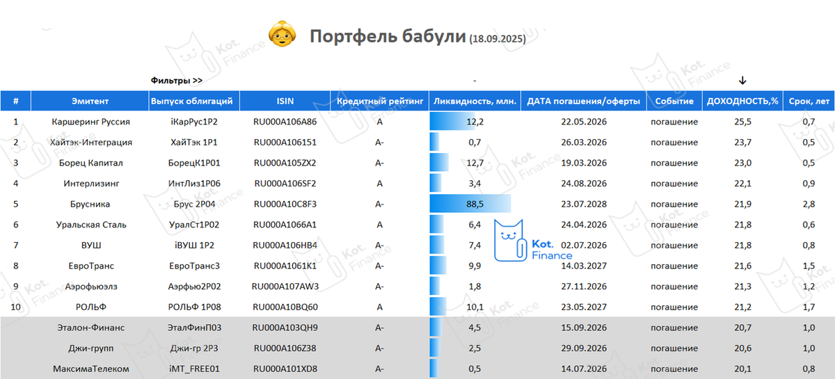 Диверсифицированный, доходный, надежный, и максимально простой портфель. Бабуля одобряет!🤟 Мы придумали портфель бабули, чтобы предлагать простые и надежные решения, не требующие много времени. Кредитный рейтинг А- и выше – золотая середина (компромисс) между риском и доходностью. Правила портфеля просты: • Без оферт, потому что бабуля может пропустить их • Высокая надежность (А- и выше), потому что толерантность к риску низкая • Высокая диверсификация, и в то же время не навязчивость с количеством выпусков, чтобы число корпоративных действий, реинвестирования, и прочего – не напрягало • Высокая ликвидность (легко купить/легко продать) Портфель бабули не предполагает ребалансировку, ведь главное правило - максимально простой портфель. Но мы экспериментируем с ребалансом в другом проекте ✅Что мы выбрали: • Делимобиль • Хайтек-Интеграция • Борец • Интерлизинг •Брусника • Уральская сталь • ВУШ • Евротранс • Аэрофьюэлз • Рольф Впервые в подборку не попал М.Видео. Не смотря на рейтинг А от