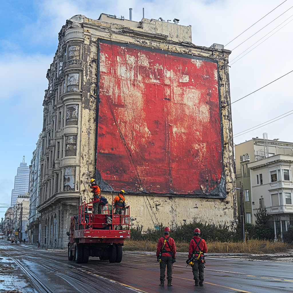 И вот наступил он - День Большого Монтажа! Тот день, к которому мы готовились целый месяц! С утра подъехала машина, в которую мы с завода должны были перетаскать все 54 элемента исполинской рекламы. Работка вышла не из легких, потому что все ужасно торопились. Ведь время для монтажа было ограничено. Центр города, рядом мэрия и облдума - это вам не хухры-мухры. Одним словом, когда мы подъехали на место, то были уже взмыленными, как после скачек. И вот нас поднимают на стреле автовышки. Мы в страховочной обвязке и пристегнуты к перилам подъёмного балкончика. О нашей безопасности впервые позаботились, как надо. На месте оказалось, что первой операцией, которую нам нужно будет совершить будет вовсе не монтаж, а демонтаж предыдущего плаката. Владелец рекламной конструкции растворился, поэтому эта нелегкая доля выпала именно нам. Старый плакат был сделан так же, как и наш, из 54 фрагментов. Нас подняли наверх на стреле. Скажу я вам - стоять на балконе дома или в балкончике автовышки - две
