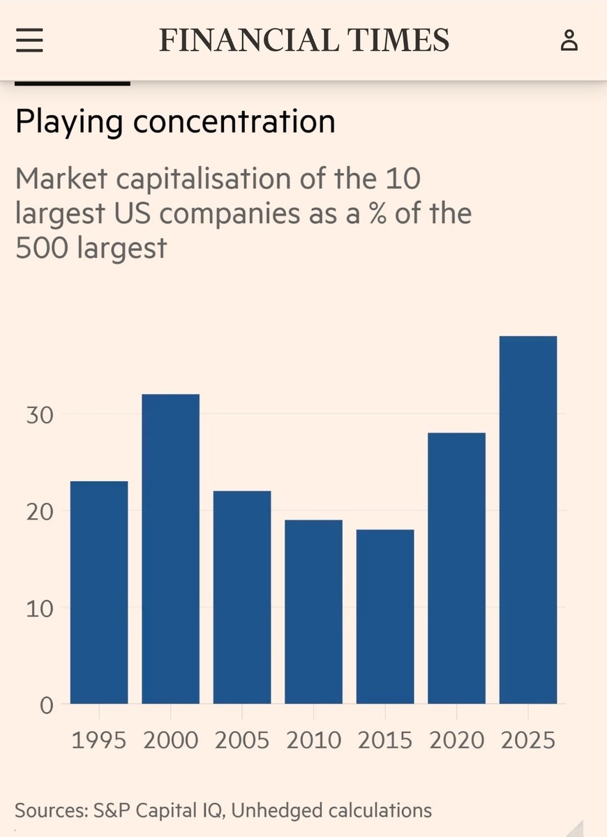 Концентрация капитализаций топ-10 компаний в % от SP500. Рынок любит лидеров 🏆 Привет, Джон Богл и индексное инвестирование 🤡 Узкий рынок США: 10 компаний тянут S&P 500. Концентрация усилилась, это очевидно и бесспорно. Тема №1 на рынке США - сверхдоля прибыли у нескольких тех-гигантов. Да, ралли слегка расширяется, но лидеры всё ещё ведут индекс. Моя позиция: степень риска такой концентрации - вопрос открытый, прибыль в экономике исторически распределяется неравномерно. Узость рынка остаётся проблемой, считаем цифры и следим за шириной. Топ-10 по капитализации (США): Nvidia, Microsoft, Apple, Amazon, Alphabet, Meta, Broadcom, Tesla, Berkshire Hathaway, JPMorgan Chase. Их вклад по данным S&P Capital IQ: 40% стоимости индекса S&P 500. 56% роста S&P с момента рыночного дна 8 апреля. 31% прироста выручки индекса за последние 12 месяцев. 55% прироста чистой прибыли индекса за последние 12 месяцев (несмотря на падение чистой прибыли у Apple, Tesla и Berkshire Hathaway). 69% при