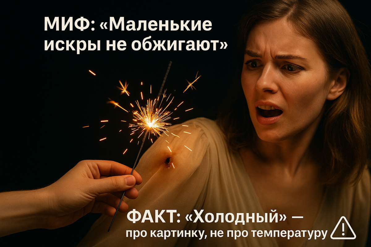 Суть: «Холодные» фонтаны и бенгальские огни выбрасывают раскалённые частицы металла. Они крошечные и быстро остывают в полёте, но при контакте с уязвимыми материалами дают краткий тепловой удар — достаточно, чтобы подпалить ткань, волосы или декор. Факт: «Холодный» — это про картинку эффекта, а не про физическую температуру.