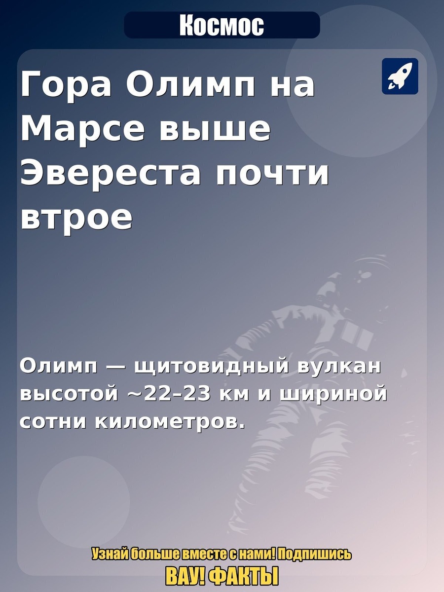 Гора Олимп на Марсе выше Эвереста почти втрое. Олимп — щитовидный вулкан высотой ~22–23 км и шириной сотни километров. Интересный факт по теме «Космос»: Гора Олимп на Марсе выше Эвереста почти втрое. Почему так: Олимп — щитовидный вулкан высотой ~22–23 км и шириной сотни километров.. Поделитесь в комментариях, знали ли вы об этом и стоит ли делать продолжение по теме. #космос #факты #астрономия