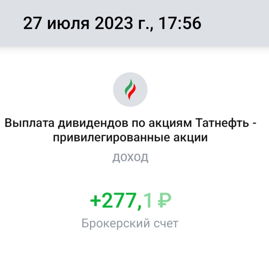 Прошел месяц. Я уже почти забыл о своих первых инвестициях, как вдруг... помню, как открыл приложение брокера с замиранием сердца и увидел там магическую надпись: «Зачислены дивиденды по акциям Татнефть: 277 рублей».