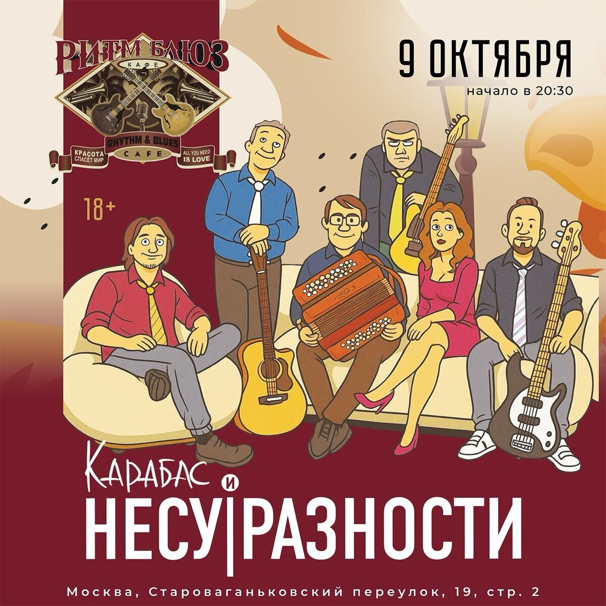 9 октября | 20:30 | Rhythm&Blues Cafe Билеты: vk.cc/cOEIBt Сыграем большой концерт в легендарном месте. Большой состав музыкантов и специальная для этого вечера программа. Самое ироничное, самое весёлое и немного хулиганское. Не пропустите ! 18+ Адрес: Москва, Староваганьковский пер., д. 19, стр. 2 #несуразности #ритмблюзкафе #концертымосква
