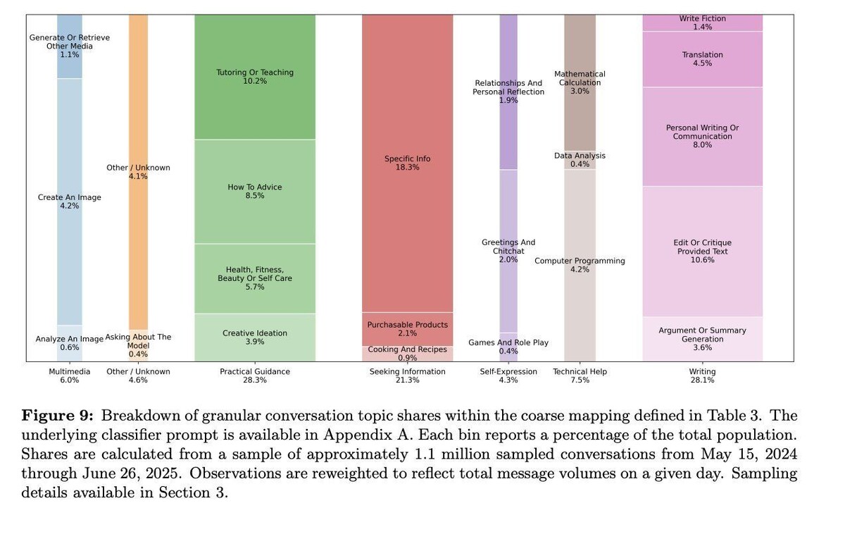 🤖 Люди уже не просто тестируют ИИ — они живут с ним. OpenAI показала, как ChatGPT реально используют в повседневке — и это не про науку, а про жизнь. 🔝 ТОП-1: писанина и правка текстов — 18% всего трафика! 📧 8% — письма (работа, личка, даже извинения 😅) ✍️ 10,6% — редактура, шлифовка, переформулировка. ТОП-2: обучение и репетиторство — 10,2%. Люди хотят личного ИИ-учителя: объяснить, повторить, проверить — без стыда и по расписанию. ТОП-3: советы “как сделать” — 8,5%. От резюме до Shopify-магазина — всё “руками ИИ”. А ещё: 💪 здоровье и фитнес — 5,7% 🌍 переводы — 4,5% 💻 программирование — 4,2% 🛒 рекомендации по покупкам — пока скромные 2,1% 💡 Суть проста: всё, за что раньше платили людям — репетиторам, редакторам, консультантам, тренерам, переводчикам — теперь просят у ИИ. Быстрее, дешевле, 24/7. ИИ не заменяет людей. Он заменяет платёжки за рутину. А люди? Пока учатся перестраиваться. 👀 Ампилов про ИТ: https://dzen.ru/id/623d938f380f3715018b6e3c