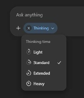 Давно ожидалось и вот случилось, добавили выбор времени думанья В последнее время thinking как будто слишком часто в 2 минуты уходит раздумий, когда это не требуется - теперь этим можно управлять