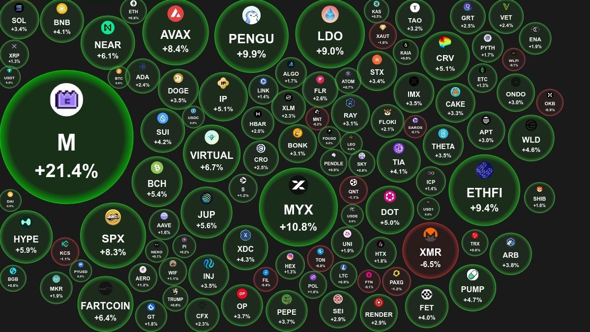 📊 Ежедневный обзор рынка криптовалют от Coinbubbles.ru 🗓 18.09.2025 09:30 по Москве. 🔗 Посмотреть на сайте 📈 Лидеры роста (из ТОП-100): 🟢 MemeCore (M): $2.9482 (+21.4%) 🟢 MYX Finance (MYX): $16.36 (+10.8%) 🟢 Pudgy Penguins (PENGU): $0.0368 (+9.9%) 📉 Лидеры падения (из ТОП-100): 🔴 Monero (XMR): $294 (-6.5%) 🔴 PAX Gold (PAXG): $3643 (-1.2%) 🔴 KuCoin (KCS): $15.75 (-1.1%) 🔍 Основные метрики: 🟢 Общая капитализация: $4092.49 млрд (+1.02%) 🟢 Общий объем торгов: $213.07 млрд (+45.33%) 🔴 Доминация Bitcoin: 56.94% (-0.65%) 🔴 Доминация Ethereum: 13.45% (-0.03%) 🔴 Индекс страха и жадности: 52 / 100: ЖАДНОСТЬ (-1) 🟢 Индекс Альтсезона: 72 / 100: НЕ АЛЬТКОИН-СЕЗОН (+2) 📖 Интересные статьи: 👉 Фьючерсы на криптовалюты в 2025 году: Полное руководство для начинающих. 👉 Как автоматизация меняет правила игры на крипторынке 😻 Наши сервисы и бонусы: 👥 VK - наша группа в VK 📈 Hyperliquid - крупнейшая DEX биржа, занимает 80% объема рынка DEX фьючерсов