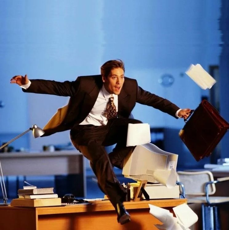 — Его заставили бежать с проектом по коридору с препятствиями → он спотыкается, роняет бумаги, кричит — работа сделана, но с потерями.