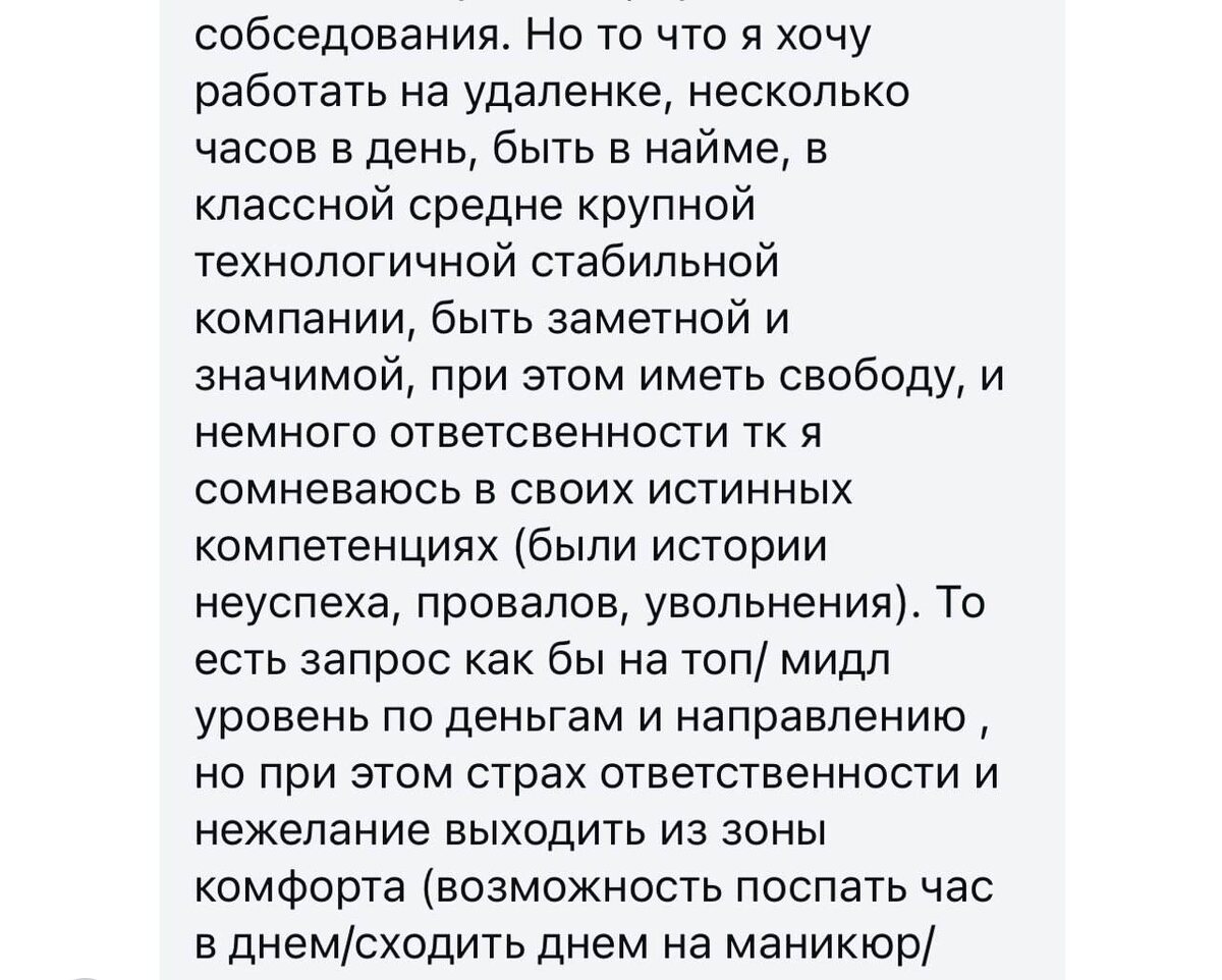 Люди не понимают реальности рынка труда и поэтому никогда не найду хорошую работу. Они пребывают в мечтах: им кажется, что существуют какие-то “необыкновенные” компании, которые предложат им идеальные условия, зарплату мечты и полный комфорт. И в этих мечтах они теряют годы жизни. Просто прочитайте запрос из скриншота. Я бы серьёзно задумалась о том, что: — мы не становимся моложе — после 50 на работе никого держать не будут и к этому возрасту важно иметь капитал и пассивный доход, а также сильный личный бренд, который позволяет работать 3–4 часа в день с высоким доходом через консалтинг и проектную работу. Но до этого момента нужно работать над карьерой прямо сейчас, без иллюзий о “волшебных местах”, где всё само сложится. А как у вас с реальностью запросов?