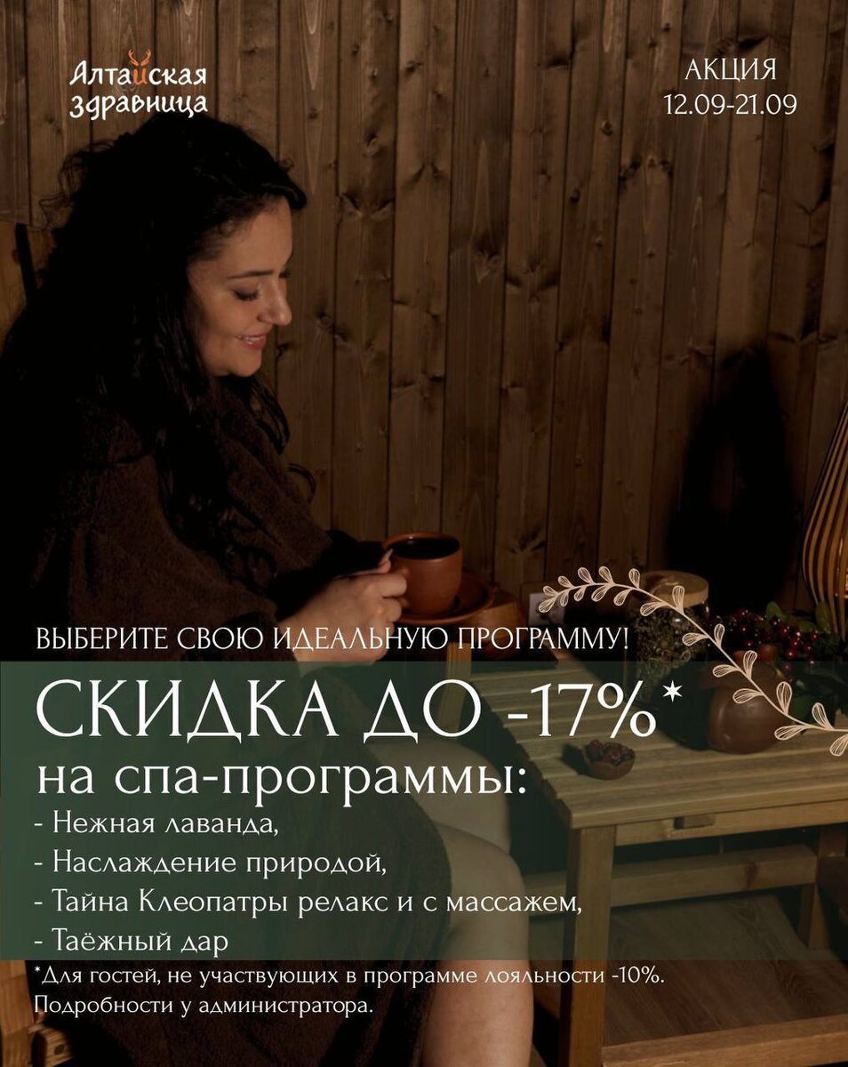 🍂 Осень - время замедлиться и подарить себе заботу. «Алтайская Здравница» - Таёжный СПА, где каждый гость открывает для себя атмосферу уюта, природы и восстановления. Здесь время течёт медленнее, а забота ощущается в каждом прикосновении 🌿 📅 До 21 сентября действуют особые условия на популярные SPA-программы с выгодой до 1.600₽: ✨ «Нежная лаванда» — 4.100₽ вместо 4.900₽ ✨ «Наслаждение природой» — 7.900₽ вместо 9.500₽ ✨ «Тайна Клеопатры» релакс — 4.500₽ вместо 5.400₽ ✨ «Тайна Клеопатры» с массажем — 5.400₽ вместо 6.500₽ ✨ «Таёжный дар» — 6.500₽ вместо 7.800₽ 🎁 Все программы можно оформить в виде подарочного сертификата - для себя или близких. Бумажного или электронного. Такой сертификат - это не вещь, а момент тишины и отдыха, который можно подарить себе или тем, кто вам дорог. 🌸Для участников программы лояльности скидка до 17%. Для остальных гостей скидка 10%. Узнать подробности и оформить сертификат можно в директ - https://vk.com/altay.spa.rostovnd