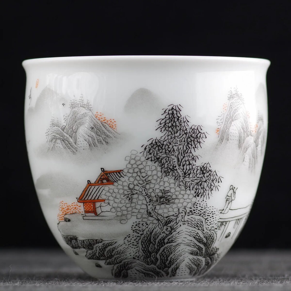 Китайский пейзажный свиток — это сложный, многослойный философский текст. Соотношение туши и незакрашенного пространства, игра пустоты и заполненных участков, ритм линий и пятен — всё это язык, на котором художник ведёт безмолвный диалог со зрителем. Он не доминирует над природой, он чувствует себя её частью, восхищается её величием. А мы, разглядывая свиток или чайный предмет с пейзажем, становимся соучастниками этого диалога.