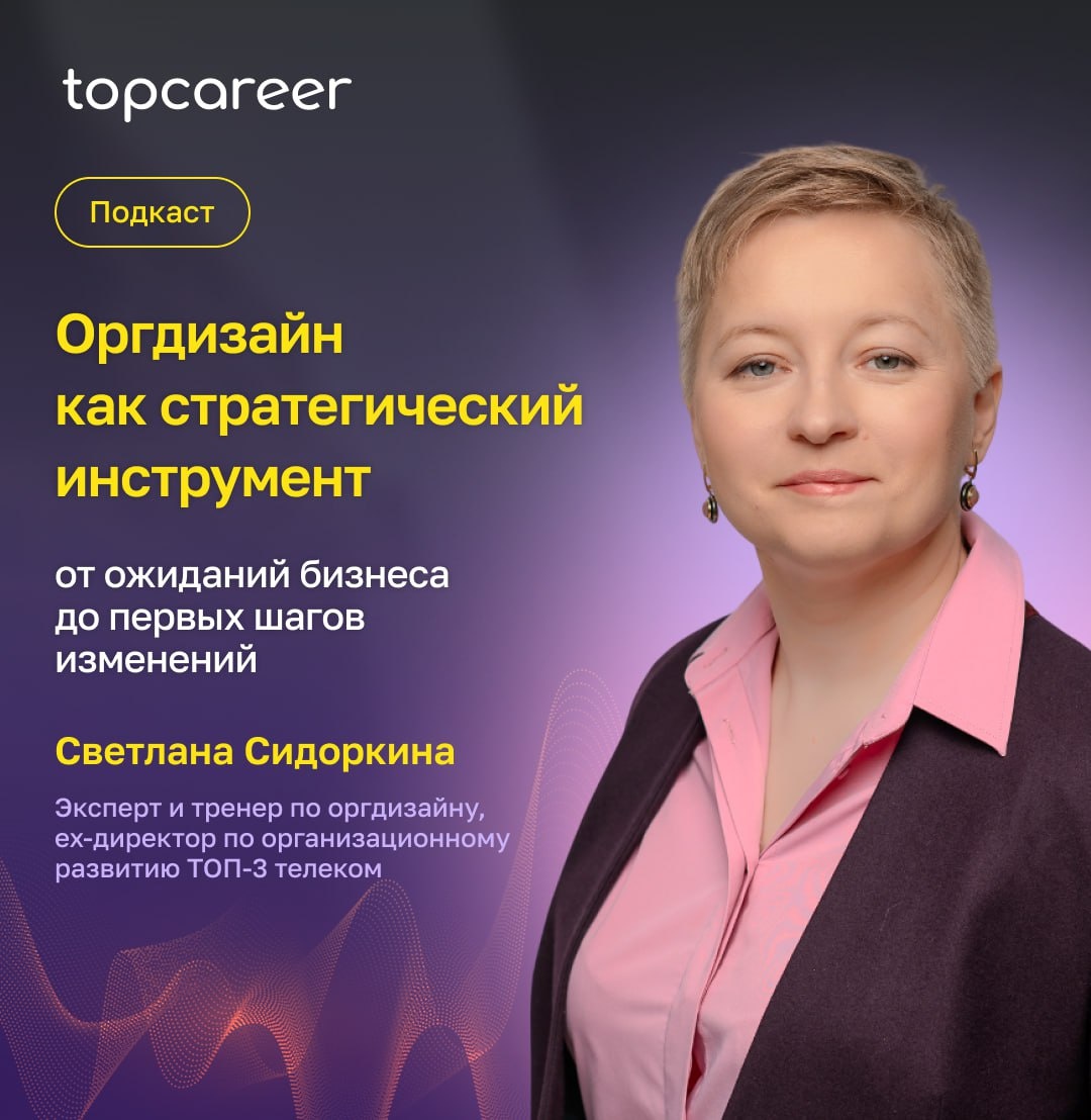 ❗️Коллеги, у нас потрясающая новость! В новом выпуске нашего подкаста приняла участие Светлана Сидоркина! Эксперт и тренер по оргдизайну, ex-директор по организационному развитию ТОП-3 телекома, а также замечательный преподаватель нашей школы. 👍 📺 Полный выпуск подкаста смотрите здесь: YouTube | Rutube Вместе с Юлией Блюм, руководителем карьерного центра topcareer, Светлана обсудила одну из ключевых функций HR — организационный дизайн и его влияние на бизнес. ▶️ Что в подкасте: ✅ Что на самом деле ждёт бизнес от оргдизайна? ✅ Люди: главный ресурс или все же главная статья расходов? ✅ Как HR может аргументировать важность оргдизайна? ✅ С чего начинать изменения: от структуры или от ролей? И еще много других интересных инсайтов от одного из лучших экспертов области. Обязательно смотрите и слушайте, чтобы понять, как выстроить оргструктуру без хаоса и сделать её устойчивым инструментом роста компании.