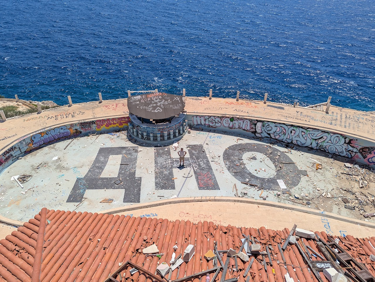 В крыше здания сохранились остатки витражного окна. Отсюда открывается великолепный вид, представляю как классно тут было завтракать, невероятно красиво, и, конечно же, отдельное очарование состоит в том, что вид открывается уже на Грецию 🙂