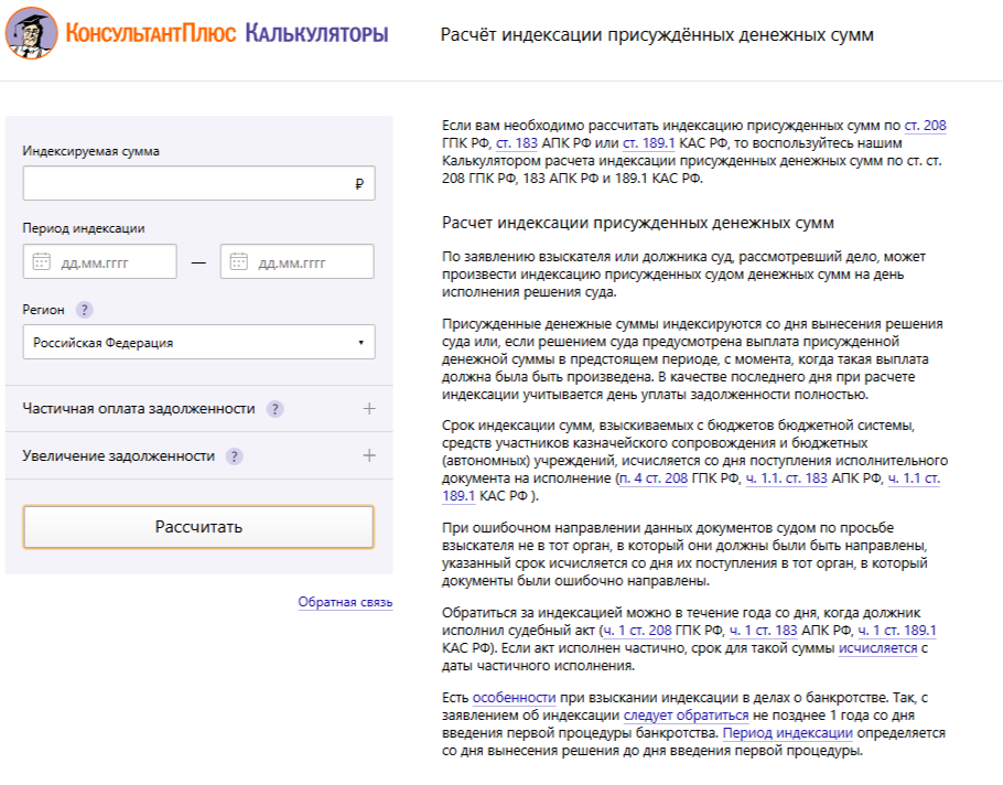 КАЛЬКУЛЯТОР РАСЧЕТА ИНДЕКСАЦИИ ПРИСУЖДЕННЫХ СУММ В КОНСУЛЬТАНТПЛЮС