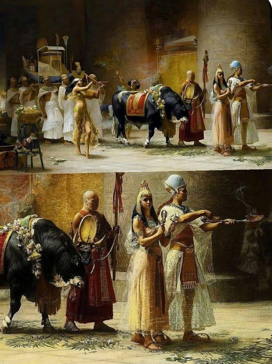 В Древнем Египте бык Апис почитался как земное воплощение бога-творца Птаха. Священным объявляли лишь того быка, у которого совпадали 27 особых признаков: белый треугольник на лбу, отметина в форме орла на спине, солнечный диск и уреус между рогами. 🎨 На картине Фредерика Артура Бриджмена «Шествие быка Аписа» (1879) изображён торжественный обряд: впереди идёт фараон с супругой, воскуряя благовония; за ними жрецы ведут украшенного цветами быка с солнечным диском и уреем между рогами. Музыка и танец сопровождают процессии, а фоном служат архитектурные мотивы, напоминающие храмы Дендера, Филы и Эдфу. Такое шествие, вероятно, входило в семидневный праздник в честь дня рождения Аписа. Пока он был жив — за ним ухаживали жрецы, словно за богом. После смерти быка мумифицировали и отождествляли с Осирисом.