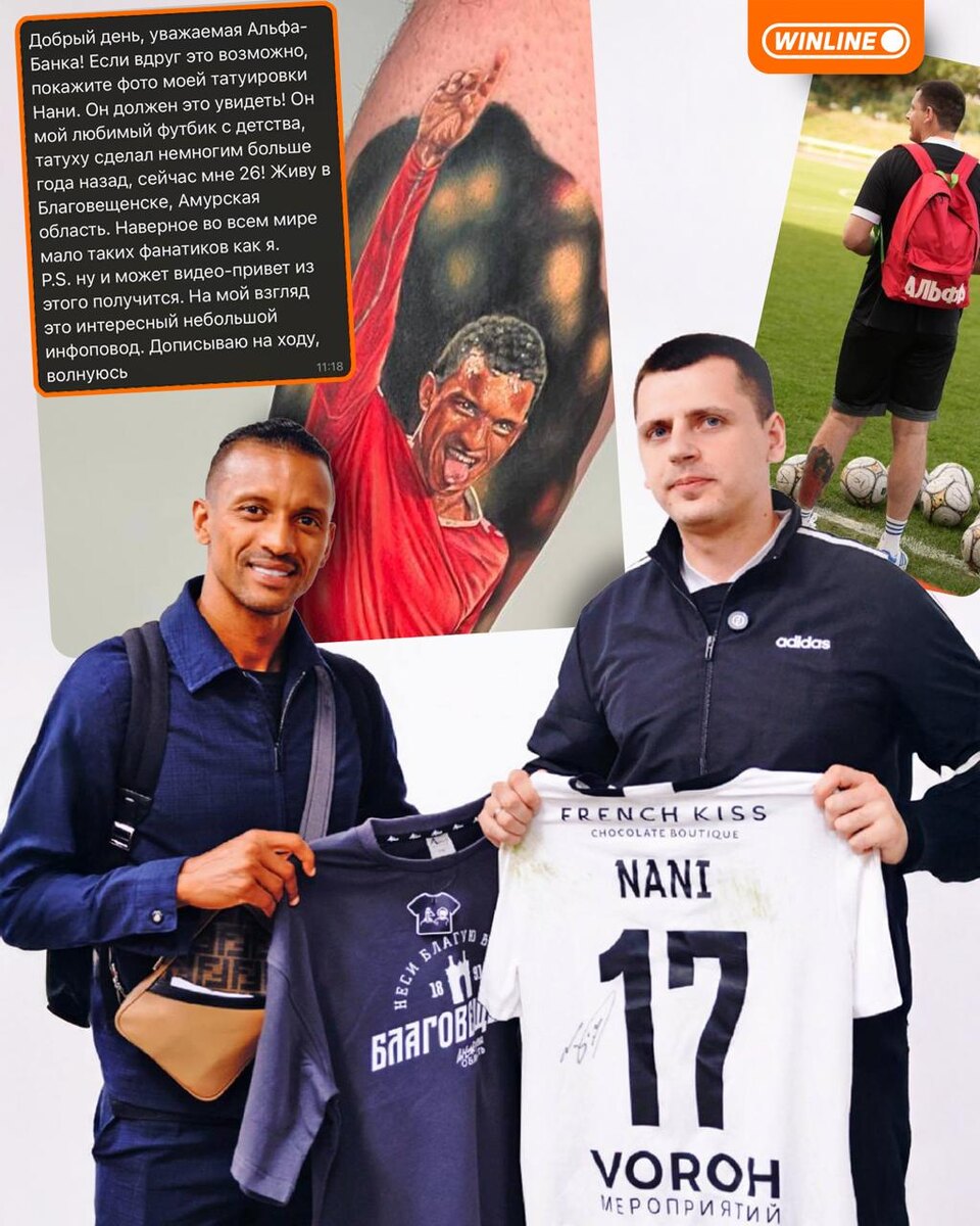 ✈️🫙 Фанат Нани из Благовещенска преодолел 8 тысяч км ради встречи! Парня зовут Данил, ему 26 лет и он живет в Амурской области. Кумир его детства — Луиш Нани, с которым он даже набил татуировку год назад и попросил показать ее в комментах. Если вдруг это возможно, покажите фото моей татуировки Нани. Он должен это увидеть! Он мой любимый футбик с детства. Ребята из Альфа-Банка оплатили парню билеты до Москвы: Нани лично познакомился с Данилом и подарил футболку с автографом.