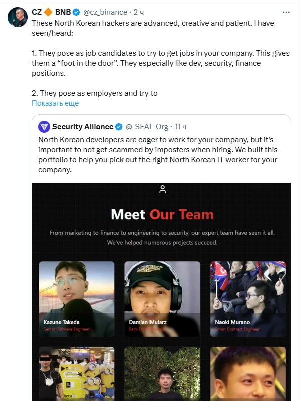 Эти хакеры из Северной Кореи — продвинутые, изобретательные и терпеливые. Вот что я видел и слышал: Они притворяются соискателями, чтобы попытаться устроиться в вашу компанию. Это дает им «плацдарм». Их особенно интересуют должности в разработке, безопасности и финансах. Они притворяются работодателями и пытаются провести собеседование с вашими сотрудниками или сделать им оффер. Во время собеседования у них «возникнут проблемы с Zoom», и они отправят вашему сотруднику ссылку на «обновление», которое содержит вирус, позволяющий захватить устройство. Или они дадут вашему сотруднику задание по программированию, а позже пришлют «пример кода». Они притворяются пользователями и присылают вам ссылки в запросе в службу поддержки. На странице будет вирус для загрузки. Они платят/дают взятки вашим сотрудникам и внешним подрядчикам за доступ к данным. Всего несколько месяцев назад крупный индийский аутсорсинговый сервис был взломан, что привело к утечке данных пользователей крупной американск