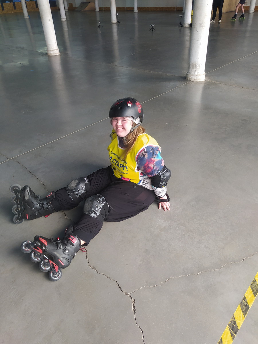 Ирина, девушка с синдромом Дауна. Для неё мы просто шикарно попали в проект по роликам. С ней тренер занимается индивидуально, отрабатывают равновесие и основные упражнения, в будущем возможно переведут на групповые занятия (но загадывать не стану) .