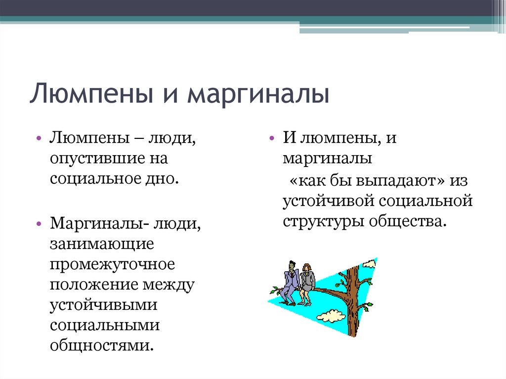 Переход от маргинальности к люмпенизации — серьёзный и непростой процесс, который может сильно повлиять на жизнь человека. Маргинальность и люмпенизация — разные вещи, и переход от одного к другому может привести к потере многих ценностей и возможностей. Маргиналы — это люди на границе разных социальных групп или культур, которые не вписываются полностью ни в одну из них. У них свои интересы, ценности и стиль жизни, который отличается от большинства. Им может быть трудно адаптироваться в обществе, но при этом они сохраняют шанс на развитие и самореализацию. Люмпены — это люди, которые опустились на самое дно общества, потеряли связь с его ценностями и живут за счёт других. У них нет постоянного дохода, и они часто оказываются втянутыми в криминал. Почему люди становятся люмпенами? Это может быть связано с разными причинами: * Финансовые проблемы: потеря работы, снижение уровня жизни и отсутствие перспектив могут привести к изоляции и утрате социальных связей. * Проблемы с психикой