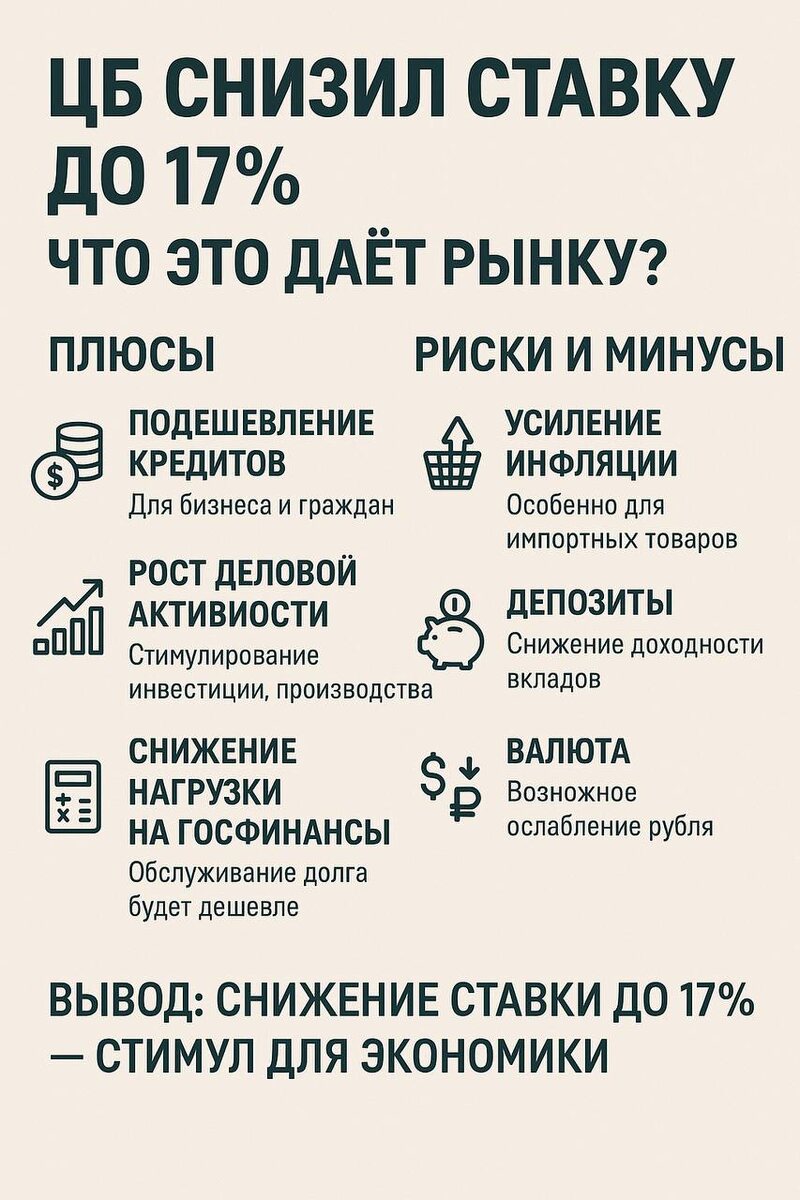 Вот сжатый разбор по тому, что даёт снижение ключевой ставки ЦБ до 17% в России, и на что стоит обратить внимание