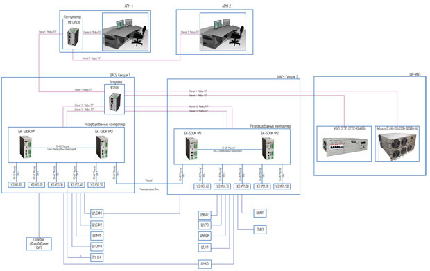 Резервированные блоки контроллера БК-500 К-06 в шкафах ШУБФ связаны между собой по сети RS-485 и через шкаф ШУБФ1 – с резервированными блоками контроллеров БК-500 К-06 в шкафу источников бесперебойного питания (ШИБП). Шкафы управления с установленными шлюзовыми микроконтроллерами ШМК и модулями УСО управляются резервированными блоками контроллеров БК-500 К-06, размещенными в шкафу источников бесперебойного питания (ШИБП) по протоколам «МАГИСТР», Modbus RTU через интерфейс RS-485. Все блоки контроллеров БК-500 К-06 через коммутатор в шкафу ШИБП связаны по сети Ethernet c дублированными АРМ1 и АРМ2. Преобразователи частоты, управляющие насосами в шкафах управления насосами, объединены по сети RS-485 и подключены к резервированным контроллерам БК-500 К-06 в шкафу ШИБП.