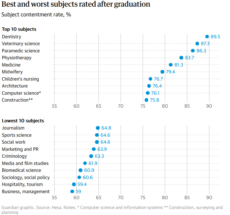 Через 5 лет после выпуска из Топ-7 бывший студент получает 60 тыс. фунтов в год, а из Bottom-7 — всего 35 тыс. фунтов. При этом прям в загоне гуманитарка — выпускники, получившие, например, степень по английской литературе даже в топовом вузе, зарабатывают всего 33 тыс. фунтов в год. Даже как-то обидно за английскую литературу:)