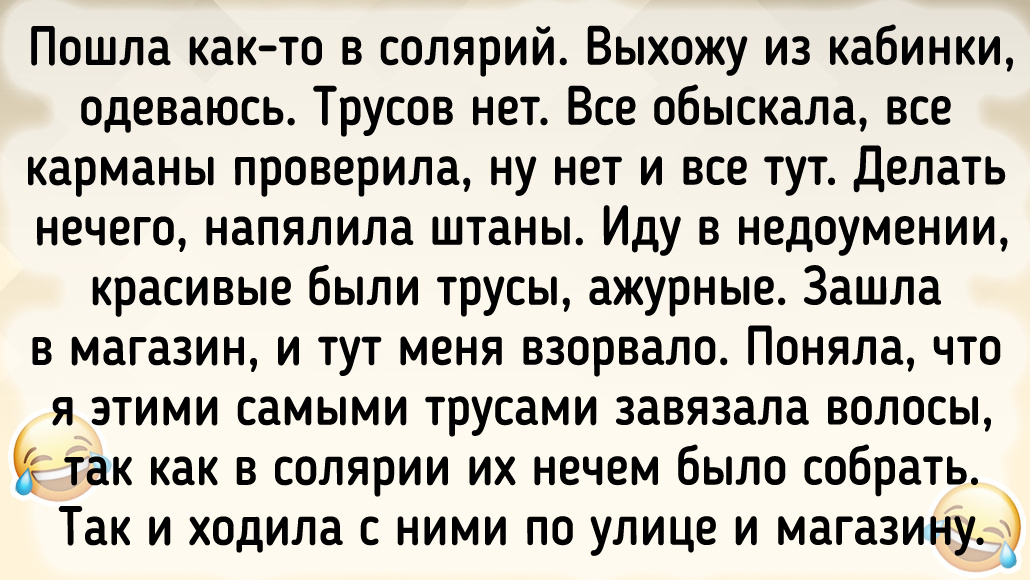 Пошла как-то в солярий. Выхожу из кабинки, одеваюсь. Трусов нет. Все обыскала, все карманы проверила, ну нет и все тут. Делать нечего, напялила штаны. Иду в недоумении, красивые были трусы, ажурные. Зашла в магазин, и тут меня взорвало. Поняла, что я этими самыми трусами завязала волосы, так как в солярии их нечем было собрать. Так и ходила с ними по улице и магазину. © Подслушано