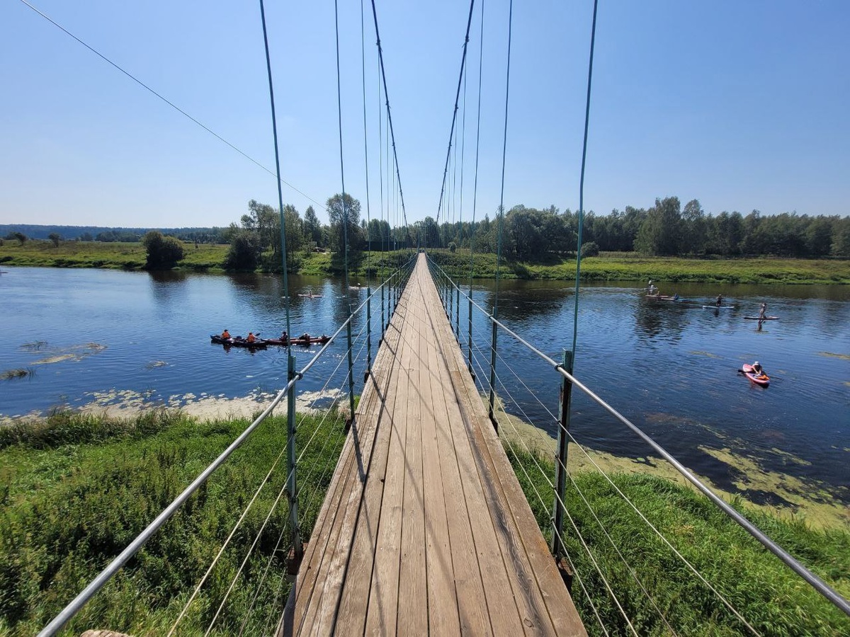 Один из самых длинных подвесных мостов Подмосковья, село Каринское в Одинцовском городском округе😍 С моста открывается прекрасный вид на реку и ее окрестности, а также на проплывающие мимо лодки и байдарки. Посетители отмечают, что мост раскачивается при ходьбе, вызывая ощущение экстрима и восторга. 📍Координаты: 55.705620, 36.688914 Фото Андрей Лиховод/Интересные места Москвы и Подмосковья