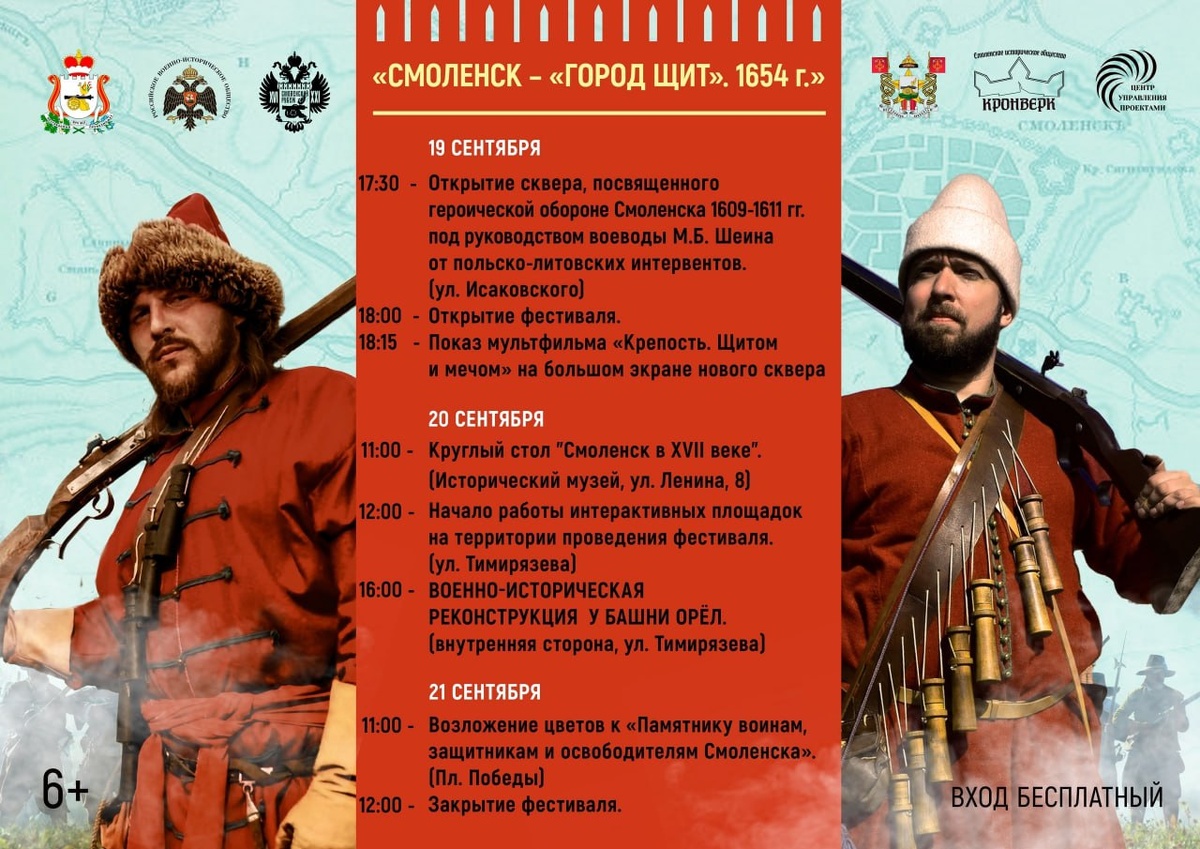 ❤️Куда сходить в Смоленске: главные события с 19 по 21 сентября Рассказываем кратко о самых интересных бесплатных событиях на этих выходных. Выбирайте, куда отправиться! 🗓 ПЯТНИЦА, 19 сентября Фестиваль «Смоленск – город щит» Место: ул. Исаковского 17:30 – Открытие нового сквера в честь обороны Смоленска 1609-1611 гг. 18:15 – Показ мультфильма «Крепость. Щитом и мечом» под открытым небом. 🗓 СУББОТА, 20 сентября Фестиваль «Смоленск – город щит» (продолжение) Место: ул. Тимирязева 12:00 – Работают исторические интерактивные площадки. 16:00 – Главное событие! Военно-историческая реконструкция у башни Орёл. Международный конкурс фольклора и ремесел Место: ШКиО «Допатинский сад» (массовое поле) Весь день – Концерты, мастер-классы, ярмарка и интерактивные площадки. Вход свободный. 🗓 ВОСКРЕСЕНЬЕ, 21 сентября Гастрофестиваль «Ложка и кружка» Место: комплекс «Гнёздово» (Красный Бор) 12:00 – Вкусная еда, кулинарные мастер-классы, квесты и ярмарка. Вход свободный. Закрытие фестиваля «Смо