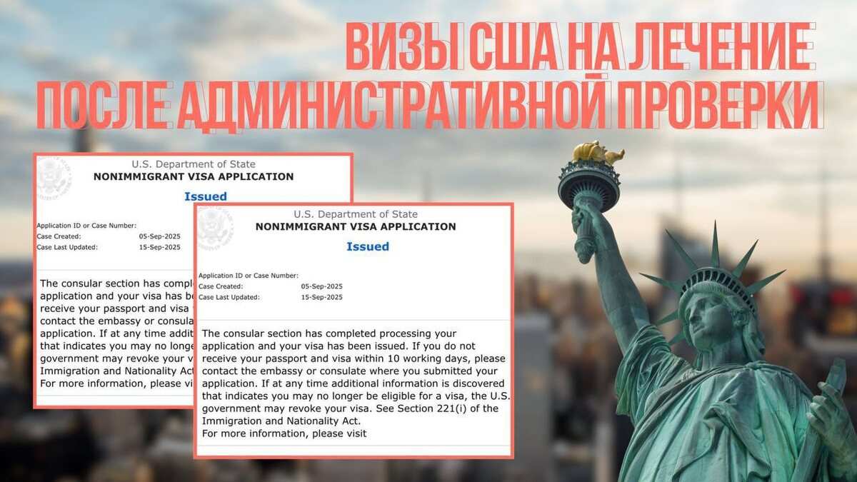 Визы США на лечение после административной проверки 🇺🇸 Собеседование было назначено до недавних изменений. 15 сентября: одобрены визы США на лечение после административной проверки гражданам РФ. Кейс: мама с сыном и сестра/тётя соответственно. Женщина не состоит в браке, не работает официально, получает пособие по уходу за сыном. Мальчик, 2014 года рождения, учится в школе. Сестра/тётя соответственно состоит в браке, работает ведущим экономистом на заводе. За последние 5 лет Клиенты посетили только Казахстан. Собеседование проходили на русском языке. Вопросы на собеседовании: – Какая цель вашей поездки? – Операцию оплачивает отец ребёнка? – Почему выбрали именно США, а не Россию для лечения? – Отец ребёнка работает? – Вы с ним в разводе? Также вопросы задали сестре: – Где вы работаете? – Вы замужем? – Есть ли у вас дети? Далее консул забрал документы на дополнительную проверку, но спустя 6 календарных дней пришел ответ, что визы одобрены! Всё это время мы были на связи с